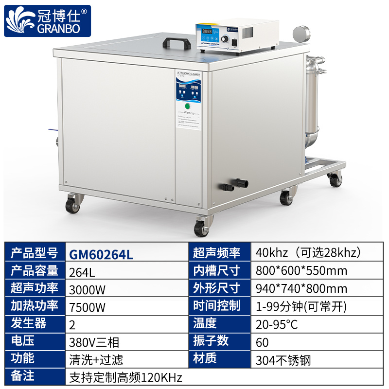冠博仕GM60264L单槽过滤循环超声波清洗机 | 264L/3000W | 工业级除油除锈设备可清洗三通配件、铜铝合金小配件