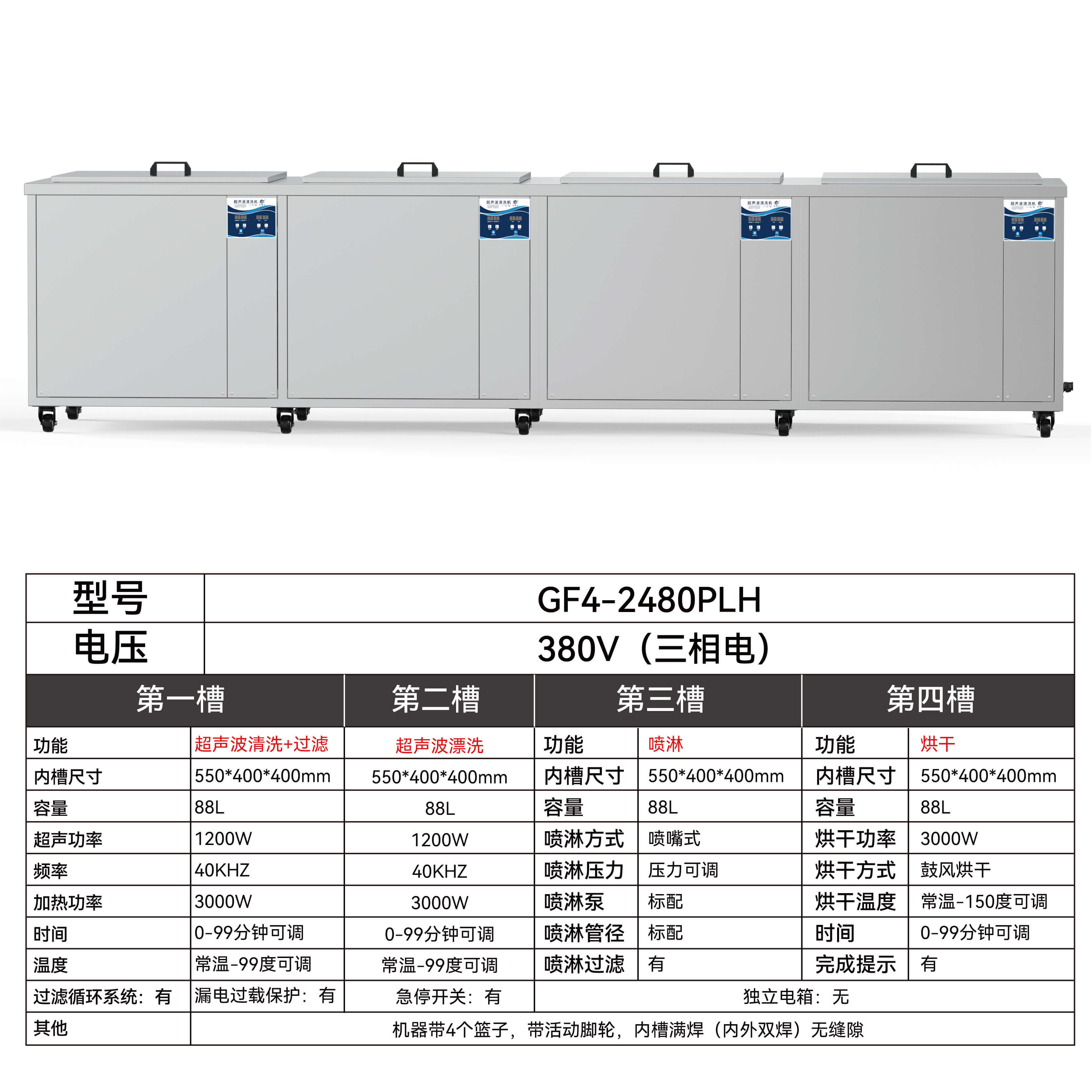 机器带4个篮子,带活动脚轮,内槽满焊(内外双焊)无缝隙