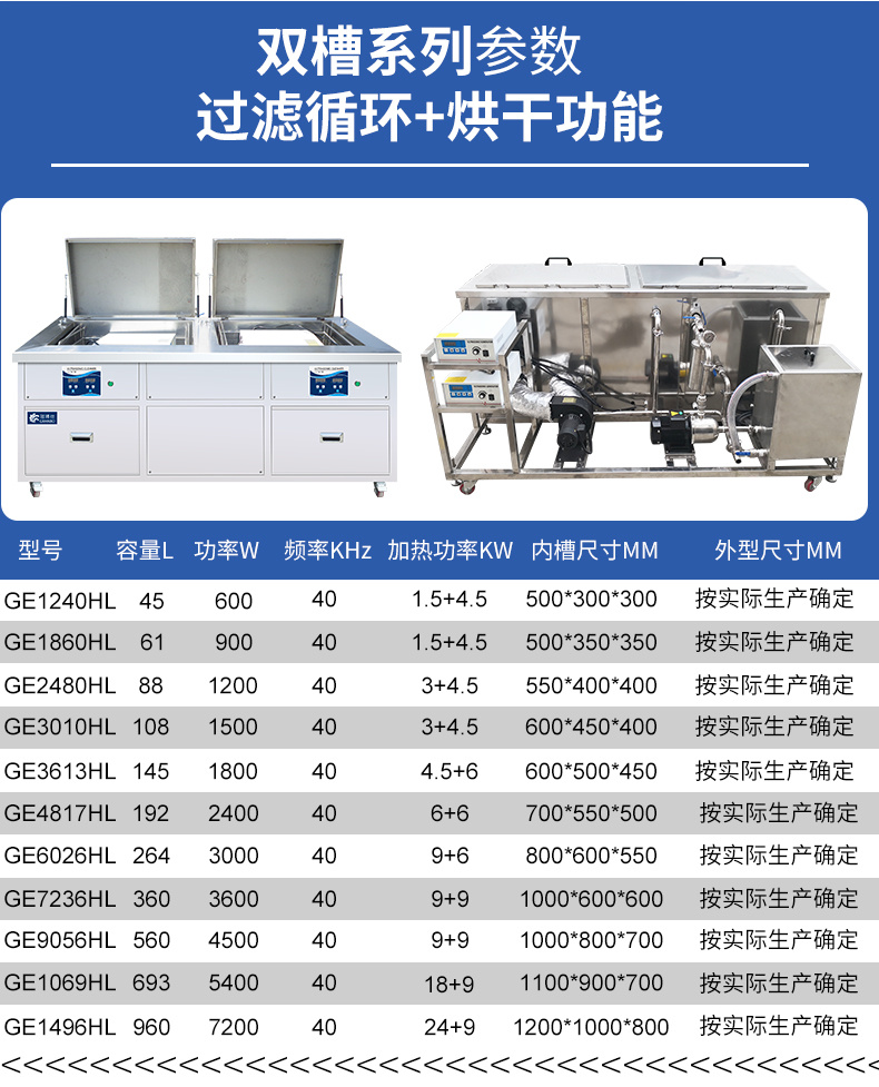- 双槽工艺:超声波清洗+过滤+漂洗,烘干等工艺可定制
